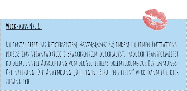 In 2019 biete ich erstmals das Jahresprogramm „Küss deine Bestimmung wach – Ein Jahr für deine Berufung“ an. Das ist ein Jahres-Trainingsprogramm für Menschen, die Nägel mit Köpfen machen wollen und die Willens sind, aus ihrem persönlichen Hamsterrad der Selbst-Sabotage und der Zweifel auszusteigen. Wenn du also keine Zeit mehr verlieren willst, genug hast von deinen eigenen Ausreden und bereit bist, mutige Schritte in Richtung deiner Berufung zu gehen, dann könnte dieses Programm genau das Richtige für dich sein. Falls du vorab schon mehr wissen willst, trage dich in diese Interessentenliste ein.
